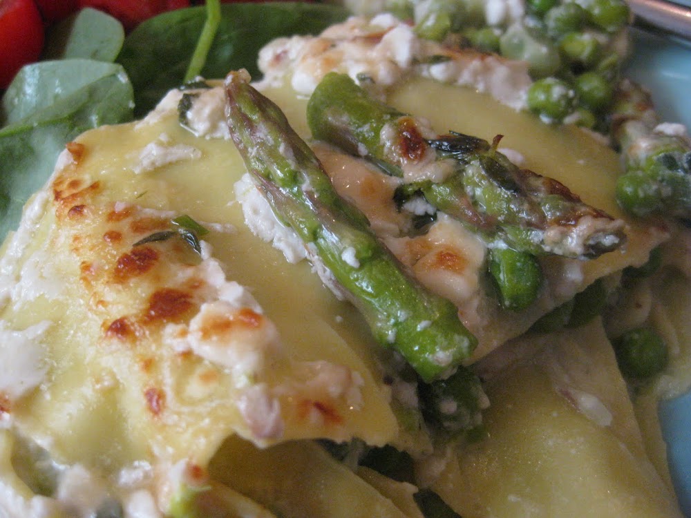6. Mix a splash of water into the second tub of cottage cheese and spread it all over the top of the lasagna. Toss the asparagus tips in the empty frying pan with a little olive oil before tipping on to the lasagna.