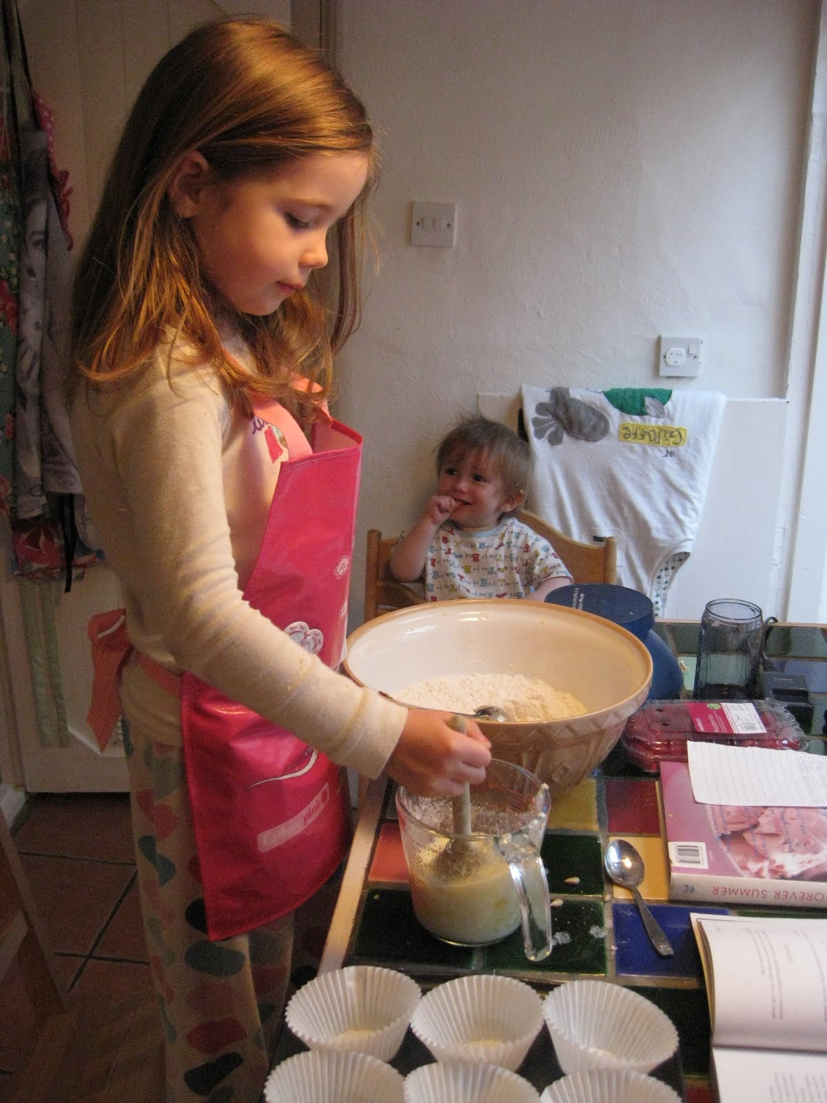 I enlisted a glamorous, pyjama-clad assistant to help me with my baking over the weekend! I adore cooking with Isabel. In my experience, children are infinitely more enthusiastic about eating things they’ve prepared themselves. Moreover, spending some time in the kitchen together provides numerous opportunities to learn. I’ve found that weighing out ingredients has helped Izzy get to grips with numbers and measurements and we often talk about where food comes from and how different ingredients are produced. Of course, the ability to prepare food confidently is an invaluable life skill in its own right. For now, Jesse is content just watching us make a big old mess in the kitchen, but I’m looking forward to a time when he can join in too.